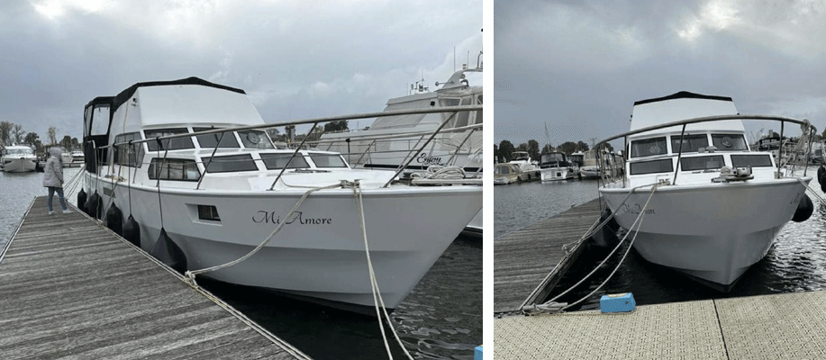 Genoeg materiaal om helemaal enthousiast te worden dus. Tegelijkertijd zat er wel druk op de ketel, de eigenaar gaf namelijk aan dat er in de middag nog iemand zou komen kijken. Iemand die ook serieus interesse had in de boot. Om de druk nog eens op te voeren liet hij mij ook alle marktplaats berichten zien die hij had gekregen. Eigenlijk kwam het er op neer dat ik de boot nu zou moeten kopen, anders zou ik waarschijnlijk te laat zijn. Hij drukte mij wel op het hart dat ik zeker geen overhaaste beslissing moest nemen en er rustig over na mocht denken, MAAR het kon ook zijn dat de boot dan al verkocht zou zijn. Mixed feelings dus. In lichte paniek heb ik nog met mijn vader ge-videobeld om te overleggen, maar een impulsieve aankoop, dat ging ons toch te ver. Hier moest zeker nog goed over nagedacht worden en op z’n minst een tweede bezichtiging gepland worden. Voor nu moest ik het dus even laten schieten en hopen dat de volgende koper de boot zou laten schieten. Helaas, ’s avonds laat kreeg ik een appje dat de boot verkocht was… 11 november 2023: tweede bezichtiging (vader vertelt) Na het bericht dat de boot verkocht zou zijn, volgt snel een tweede bericht. 'Nee, de boot is toch niet verkocht. De andere koper haakte af omdat hij geen haven kon vinden'. Huh?! Samen met zijn vader bezoekt Hilmar de boot daarom opnieuw. Zijn vader gaat mee voor een inspectie. Daarvoor gaat een uitgebreide checklist mee. Samengevat: een groot schip. Bijna imposant. Want ik ben een zeilboot van 8,5 meter gewend, met een inboard diesel van 18PK. Dit schip is ruim 14 meter lang, 4 meter breed en heeft twee veel dikkere machines staan dan nodig voor dit schip. Twee 120PK 6-cylinder motoren staan er in de machinekamer, en met alles wat daaromheen staat, wordt het voor mij 'een brug te ver'. Dat is bijna niet meer zonder specialist te onderhouden of repareren. Wel lijkt het schip wat romp betreft in orde te zijn. Al zien we enkele spanten die gedeeltelijk niet meer zo hard zijn als we zouden willen zien. Alle huiddoorvoeren en afsluiters zijn het jaar ervoor vernieuwd en het gehele onderwaterschip zou in een nieuw verfsysteem gezet zijn. Op basis van foto's nemen we dat met enige tegenzin dan maar aan. Ik houd niet zo van aannames. Van binnen is het schip echter totaal verouderd, concreet op veel plekken verrot (betimmering) door condens- en regenwater en blijkt het elektrisch systeem een 'spaghetti' van aan elkaar geregen draden. Vele ervan zijn aan 1 uiteinde niet aangesloten. Evenzoveel aan beide einden niet. Ook wat de bediening betreft blijken de meeste instrumenten niet aangesloten. Wat wel werkt is de roestand indicator en de brandstofmeters van de twee nieuwe RVS dieseltanks. En maximaal een handvol lampjes en de bilgepomp blijken te werken. Hilmar wordt er blij van. Dat het schip van binnen een janboel is, is voor hem een zegen. Juist daardoor is het voor een scherpe prijs te koop en kan hij het naar zijn hand zetten. Hij heeft immers wél twee rechterhanden, die de huidige eigenaar duidelijk mist, reden waarom deze het schip toch verkoopt. Een poging de achterkajuit te betimmeren, laat ons al direct zien dat hier alle kennis van houtbewerking mist. Ik ben eerlijk naar Hilmar: 'er is teveel op dit schip dat ik niet begrijp. Met name in de machinekamer en elektrisch systeem zit de buikpijn'. Ik moet er niet aan denken. Hilmar ziet het anders. Die kijkt met een andere blik. Is bovendien jong en leergierig. En nog niet gehinderd door de ervaringen van pa. Ik zeg hem nog: 'jongen, een boot is een mooi bezit. Maar dat bezit mag nooit bezit van jou nemen'. Op weg terug bedenken we ons dat we niet hebben gevraagd de motoren te starten. De verkoper heeft dit ook niet uit eigen beweging gedaan. We strijken na een halfuur rijden neer bij een La Place en eten een hapje. Hilmar heeft genoeg gezien en is helder: hij wil dit avontuur doorzetten. En hij belt de verkoper om over de prijs te onderhandelen. Hilmar geeft de verkoper aan dat hij de boot wil kopen voor zijn maximale budget van 25.000 euro. Verkoper vraagt 30.000 euro. Na enig overleg rolt er een overnameprijs uit van 26.500 euro waar beiden zich in kunnen vinden en wordt de koop mondeling gesloten. Een koopovereenkomst zullen wij opstellen zodat een aanbetaling gedaan kan worden na ondertekening. Diezelfde avond gaat de koopovereenkomst naar de verkoper...maar deze begrijpt enkele zinnen niet. En dringt aan op aanbetalen. Hilmar betaalt aan zonder dat de overeenkomst is getekend. Ik vind dat totaal een onjuiste volgorde. 18 november 2023: derde bezichtiging, proefvaart en koopovereenkomst getekend (vader vertelt) We, Hilmar Dominique en vader, komen weer aan op de haven. We wachten even in de auto omdat het nog regent. De bui is bijna over. En we zijn dik een kwartier te vroeg. Onderweg naar het steiger ontmoeten we ook de verkoper en zijn vriendin. Samen lopen we naar de boot. Op de boot volgen nog enkele checks en wordt besloten de motoren te starten en een proefvaart te maken. De bakboordmotor start na enig aandringen, de stuurboordmotor heeft er duidelijk meer moeite mee. Dikke rookpluimen, en de verkoper zegt nog: 'tja, het is een oude motor hé!' Minimaal zijn we getuige van een welliswaar steenkoude maar toch zeer moeizame start, want na lang aandringen gaat de motor lopen. Na losgooien stuurt de verkoper het schip de box uit. En hier zie ik voor het eerst het voordeel van twee motoren. Als ware het een tank stuurt verkoper door alleen bediening van de motoren de boot rustig de box uit en richting open water. De hydraulische besturing, het stuurwiel op de flybridge, werkt met een grote vertraging. De roerstandindicator werkt, dat helpt. Maar er zijn veel slagen van het stuurwiel nodig om enige uitslag van het roer te krijgen. Dat lijkt vermoeiend sturen. Terug in de box gaan de motoren uit. Praktisch betekent dit op een knop drukken voor de SB motor, en de motorrruimte in voor de BB moter. Die kan alleen met de hand worden afgezet omdat de bedienin